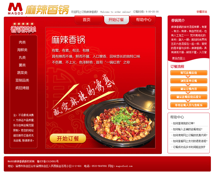 第六張 麻辣香鍋的網(wǎng)站這個(gè)應(yīng)該是2012年做的網(wǎng)站,當(dāng)時(shí)去北京出差第一次吃到了麻辣香鍋,太辣了吃不了。這個(gè)網(wǎng)站整體是有一個(gè)下單流程,可以直接在網(wǎng)站上下單,送餐上門。