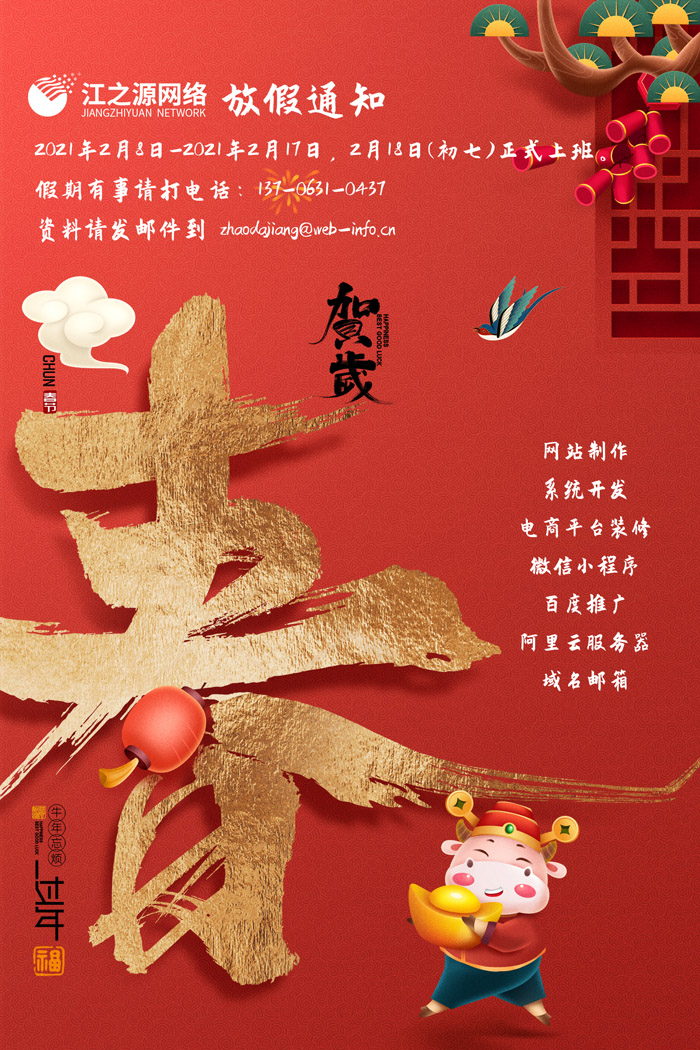放假時(shí)間:2021年2月8日-2021年2月17日,2月18日(初七)正式上班。