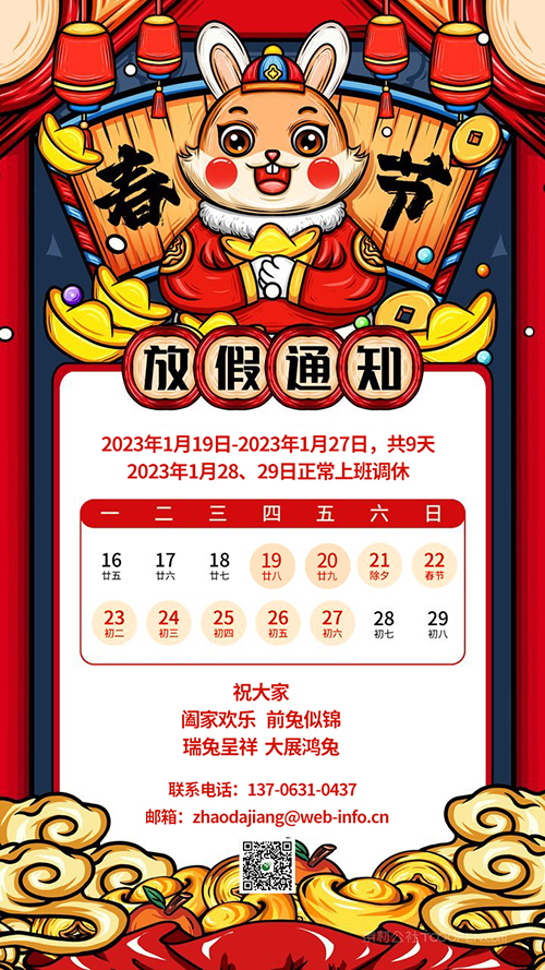 江之源網(wǎng)絡(luò)于2023年1月19日-2023年1月27日放假共9天,2023年1月28、29日正常上班調(diào)休。